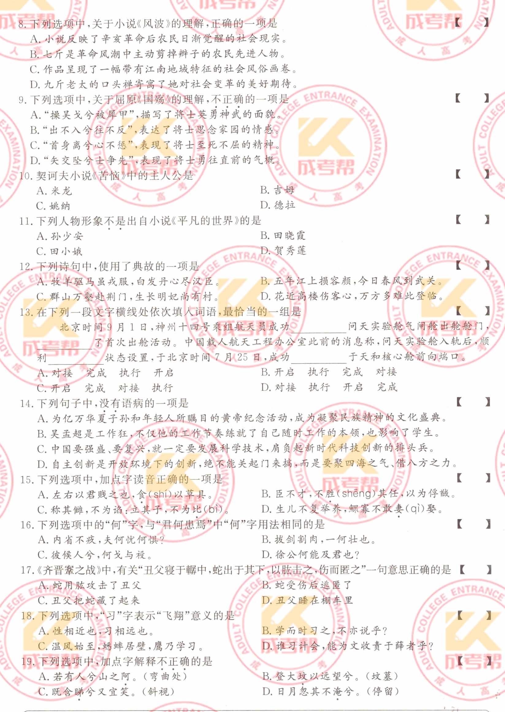 2022年山东成人高考专升本大学语文考试真题及答案